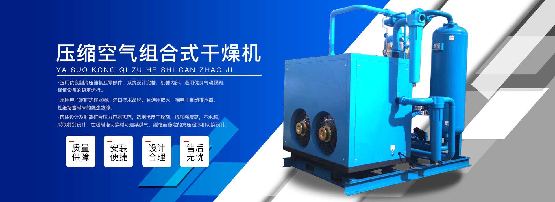 本公司系中國科學院、重鋼院、機電技術(shù)設計院、氣動技術(shù)研究所等相關(guān)專家合作的具有雄厚技術(shù)力量的高科技實體,是一個專業(yè)從事各種氣體干燥凈化及分離純化設備研究開發(fā)及推廣應用的高科技公司。公司積多年對壓縮空氣凈化設備的生產(chǎn)技術(shù)和銷售經(jīng)驗,并在消化吸收國外先進技術(shù)的基礎(chǔ)上,結(jié)合國內(nèi)實際工況特點,研制出適合國內(nèi)外廣大用戶的“滬盛”牌HSD系列壓縮空氣冷凍式干燥機、吸附式干燥機、后部冷卻器、預冷機組、工業(yè)用冷水機組和HF系列壓縮空氣高效精密過濾器(國產(chǎn)濾殼,美國漢克森HANKISON濾芯)等13大系列計300多種規(guī)格產(chǎn)品。并且新研發(fā)出燥式干器, 廣泛應用于電力、冶金、電子、機械、石油、化工、汽車制造、紡織、化纖、輕工、造紙、橡膠、儀表、食品、空氣、卷煙、生物、醫(yī)藥、日化等行業(yè),在國內(nèi)同行業(yè)中一直處于領(lǐng)先地位。